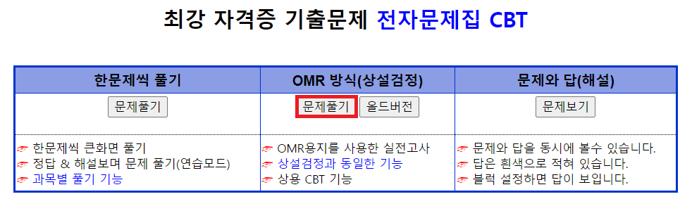 3. OMR 방식(상설검정) 문제 풀기를 클릭합니다.